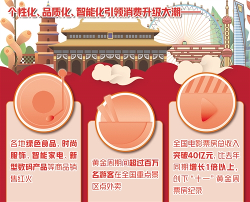 黄金周期间,体验消费广受欢迎。旅游、观影、看展、运动、读书等过节方式受到越来越多民众青睐。北京、嘉兴、南昌、井冈山、遵义、延安等红色旅游热点城市受到游客欢迎。一批主旋律影片引发国庆观影热潮,全国电影票房总收入突破40亿元,比去年同期增长1倍以上,创下“十一”黄金周票房纪录。重点监测影城、KTV、主题乐园等体验型消费场所客流量同比增长20%以上。各地博物馆、科技馆、文化馆、展览馆人头攒动,北京展览馆举办的庆祝新中国成立70周年大型成就展吸引大批观众参观。