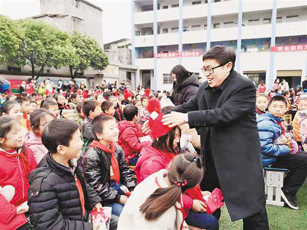 2018年12月26日,张倵瑃到武隆区火炉镇中心小学校,参加公益捐助活动,给孩子们戴棉帽。通讯员 许静 摄