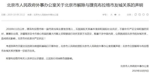 中新网10月10日电 据北京市人民政府门户网站消息,北京市人民政府外事办公室10日发布《关于北京市解除与捷克布拉格市友城关系的声明》(以下简称《声明》)。《声明》称,捷克布拉格市新一届市政当局主要官员等人,屡屡在台湾、涉藏等问题上采取错误行动并发表不当言论,干涉中国内政,挑战两市的友城关系。北京市表示严正抗议,立即解除与布拉格市友城关系并暂停一切官方往来。