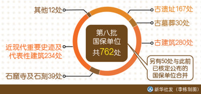 据悉,第八批国保单位共762处,另有50处与此前已核定公布的国保单位合并。从类型看,包括古遗址167处,古墓葬30处,古建筑280处,石窟寺及石刻39处,近现代重要史迹及代表性建筑234处,其他12处。从省级行政区域看,这一批入选较多的省份有山西、河南、浙江、安徽、湖南。第八批公布后,我国国保单位总量将达到5058处,包括古遗址1194处,古墓葬418处,古建筑2160处,石窟寺及石刻307处,近现代重要史迹及代表性建筑952处,其他27处。