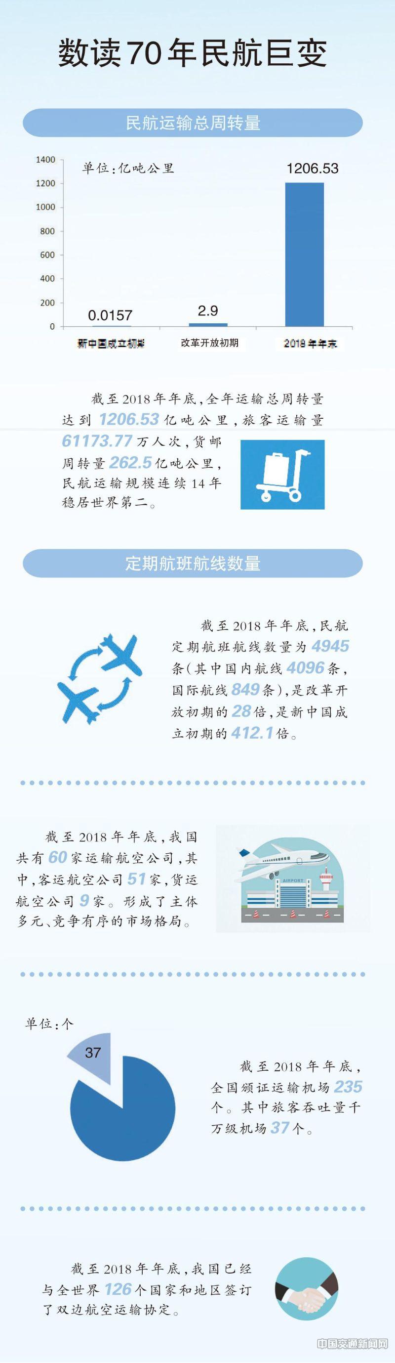 悠悠70载,“C”字像一张被拉弯的弓,在一代代民航人的接续奋斗中,在交通强国的使命担当中,射出了刺破云霄的箭!如今,打开中国民航航线示意图,大小不一的代表着机场的红点和密集交织的航线网令人惊叹。截至2018年年底,中国民航定期航班、航线已达4945条。2018年全年运输总周转量达到1206.53亿吨公里,旅客运输量61173.77万人次,货邮周转量262.5万吨公里,民航运输规模连续14年稳居世界第二。民航人饱蘸心血,写意蓝天,绘出了一幅最新最美的画卷。