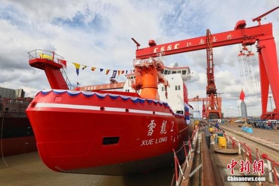 根据设计,“雪龙2”号船长122.5米,船宽22.3米,吃水7.85米,吃水排水量约13990吨,续航力2万海里,自持力60天载员90人,能以2至3节的航速在“冰厚1.5米加雪厚0.2米”的环境中连续破冰航行。中新社发 蒋小威 摄