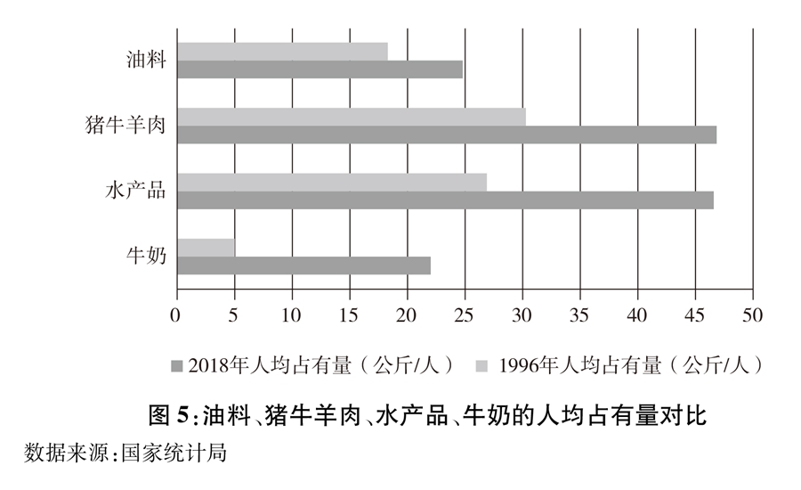 ——膳食品种丰富多样。2018年,油料、猪牛羊肉、水产品、牛奶、蔬菜和水果的人均占有量分别为24.7公斤、46.8公斤、46.4公斤、22.1公斤、505.1公斤和184.4公斤,比1996年分别增加6.5公斤、16.6公斤、19.5公斤、17公斤、257.7公斤和117.7公斤,分别增长35.7%、55%、72.5%、333.3%、104.2%和176.5%。居民人均直接消费口粮减少,动物性食品、木本食物及蔬菜、瓜果等非粮食食物消费增加,食物更加多样,饮食更加健康。