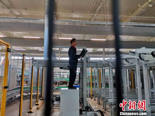 图为在包装车间,工作人员在调试设备。 郝学娟 摄