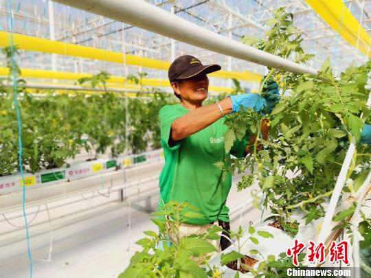 图为工作人员为番茄吊蔓。 郝学娟 摄