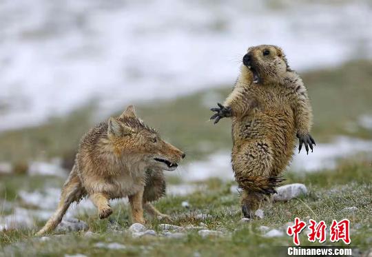 鲍永清介绍,《生死对决》拍摄地在中国青海祁连山国家公园天峻县境内,图片中两只动物分别是藏狐和喜马拉雅旱獭,它们是中国青藏高原上特有物种。