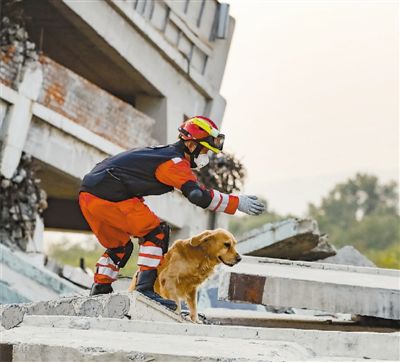 图为10月22日,中国国际救援队队员携带搜救犬在国家地震紧急救援训练基地进行地震搜救演练。新华社记者 沈伯韩摄