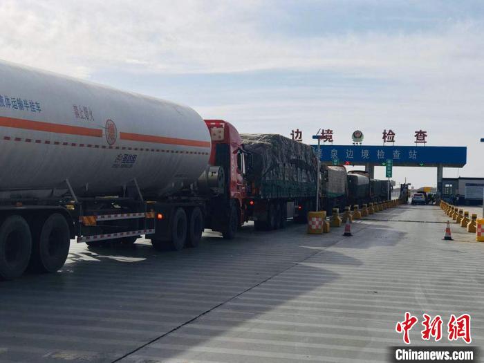 公婆泉边境检查站位于高速公路上,货车居多。图为货车排队进行检查。 艾庆龙 摄