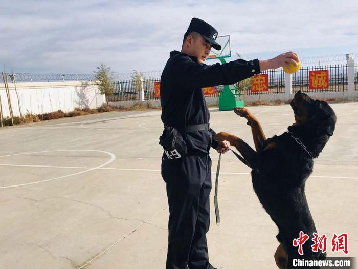 公婆泉边境检查站警犬训导员王鹏飞在训练警犬。 艾庆龙 摄