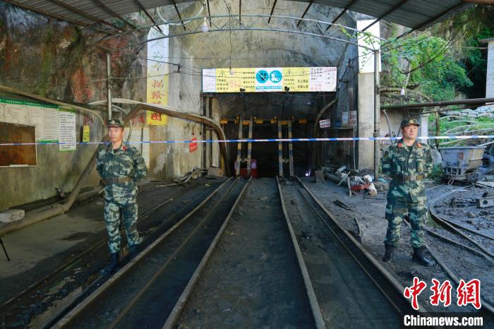图为武警官兵正在对发生冒顶事故的南丹庆达惜缘矿业投资有限公司大坪村矿区锌银铅锑锡铜矿2号隆口实施警戒。 肖文伯 摄