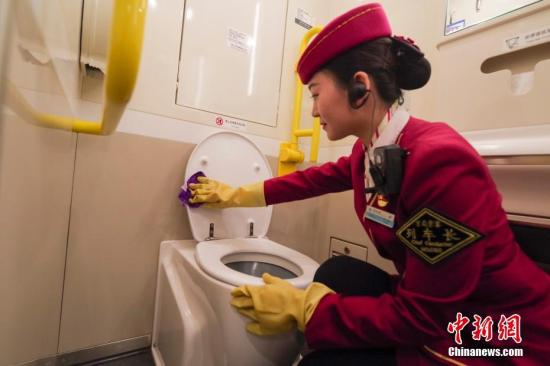 资料图:从北京南开往上海虹桥的G13次“复兴号”动车组列车上,列车长正在使用专用抹布擦拭马桶。中新社记者 贾天勇 摄