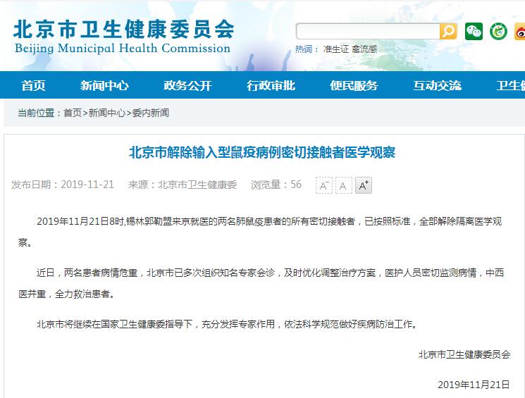 中新网11月21日电 据北京市卫生健康委网站消息,2019年11月21日8时,锡林郭勒盟来北京就医的两名肺鼠疫患者的所有密切接触者,已按照标准,全部解除隔离医学观察。