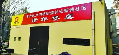 西四环外大成路附近,“老年餐桌”的牌匾挂在了长安新城小区一处人防工程口部房门前,屋内,几位居民正在热气腾腾的菜品前挑选。