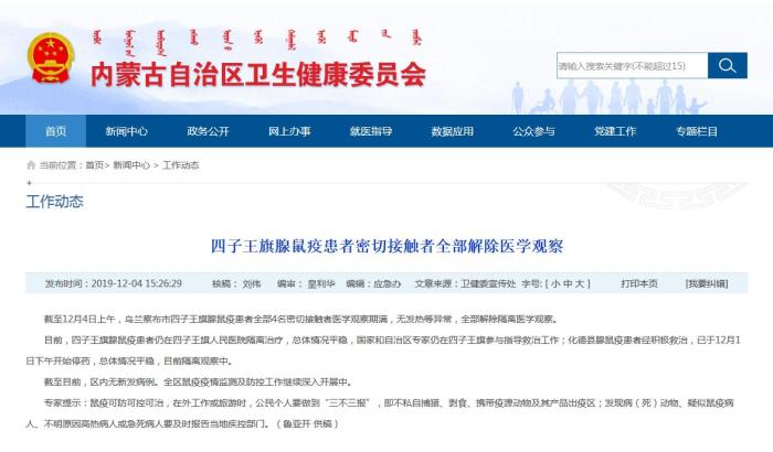 中新网12月4日电 内蒙古自治区卫健委网站4日发布消息称,截至12月4日上午,乌兰察布市四子王旗腺鼠疫患者全部4名密切接触者医学观察期满,无发热等异常,全部解除隔离医学观察。
