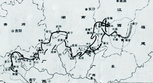 红七军主力北上江西会合中央红军的路线示意图。