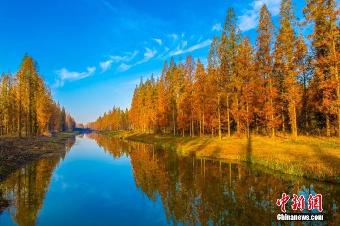 蓝天碧水黄树林。孙华金 摄