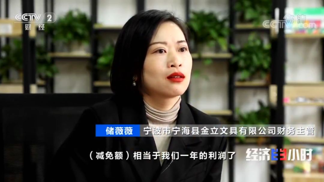 宁波市宁海县金立文具有限公司财务主管 储薇薇:今年我们预估交50万左右,(减免额)相当于我们一年的利润了,大家都很高兴的。