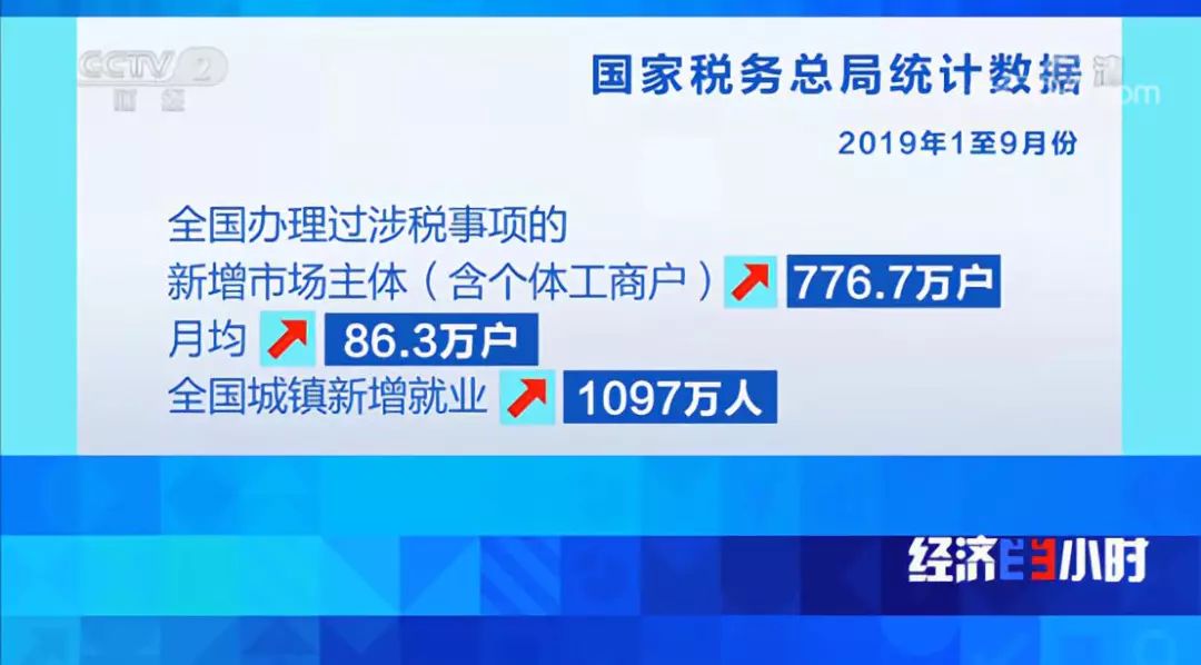 2019年1至9月份,民营经济纳税人新增减税9644亿元,占新增减税总额的64%,受益最大。同时,全国办理过涉税事项的新增市场主体(含个体工商户)增加776.7万户,月均新增86.3万户。全国城镇新增就业1097万人。
