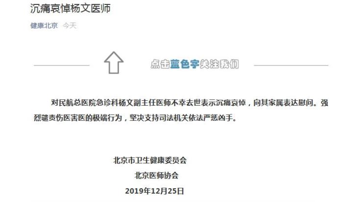 12月24日6时许,北京民航总医院急诊科副主任医师杨文在正常诊疗中,遭到一位患者家属的恶性伤害,致颈部严重损伤。事发后,该院第一时间组织全院力量进行抢救,同时,北京市卫生健康委迅速调集北京协和医院、中日友好医院和北京同仁医院相关专家进行会诊,全力救治。杨文终因伤势过重,经抢救无效,于2019年12月25日零时50分去世。