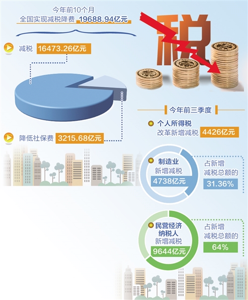 统计显示,今年前10个月,全国实现减税降费19688.94亿元,其中减税16473.26亿元,降低社保费3215.68亿元。
