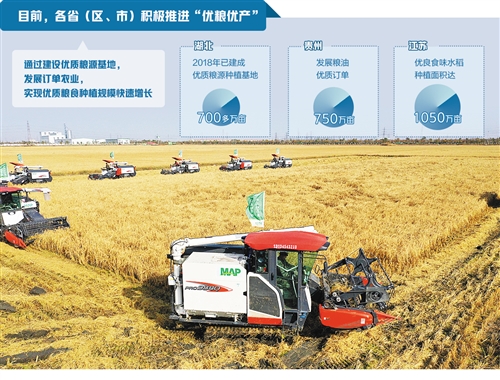 好粮食是种出来的。目前,各省(区、市)积极推进“优粮优产”,通过建设优质粮源基地,发展订单农业,实现优质粮食种植规模快速增长。湖北2018年已建成优质粮源种植基地700多万亩;贵州发展粮油优质订单750万亩;江苏优良食味水稻种植面积达1050万亩;中化农业着力打造“现代农业技术服务平台”,推广种植技术,种植优质品种,规模将达3000万亩。