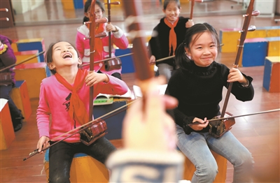 放学后,江苏省淮安市天津路小学学生张阅(左)和小伙伴相约来到学校免费提供的二胡课后延时服务班,在老师的细心指导下学习拉“快乐二胡”。她说:“每天上延时班,是我最快乐的时光!”