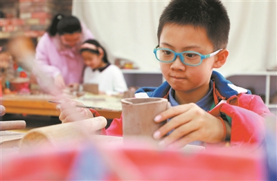 樊彦序在陶泥课后延时服务班上专心学习制作笔筒。仅这个学期以来,他就已经完成了茶壶、人物、轮船等陶泥作品,动手实践能力得到不断提高。