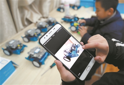 两名学生在创客课后延时服务班上一起专心学习操控可编程机器人。不久前,该校学生获得了全市创客大赛一等奖。