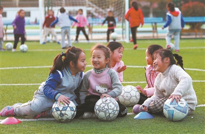 几名女生在开心地谈论刚刚射门训练时的趣事。快乐足球,让她们课后活动更丰富、童年更精彩!