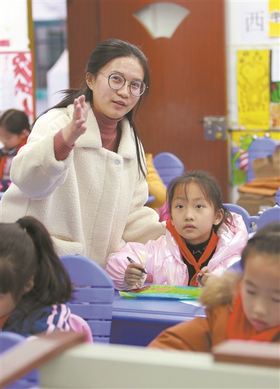学校提供的儿童画课后延时服务班受到许多学生的喜爱。这是张萌萌老师正在指导学生学习如何构图、涂色,用手中的画笔描绘五彩缤纷的童年世界。