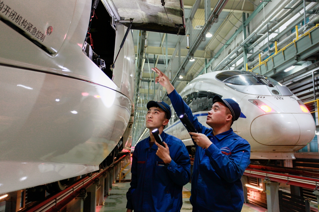 图为沈阳局集团公司职工精心检修动车组列车。 高飞/摄