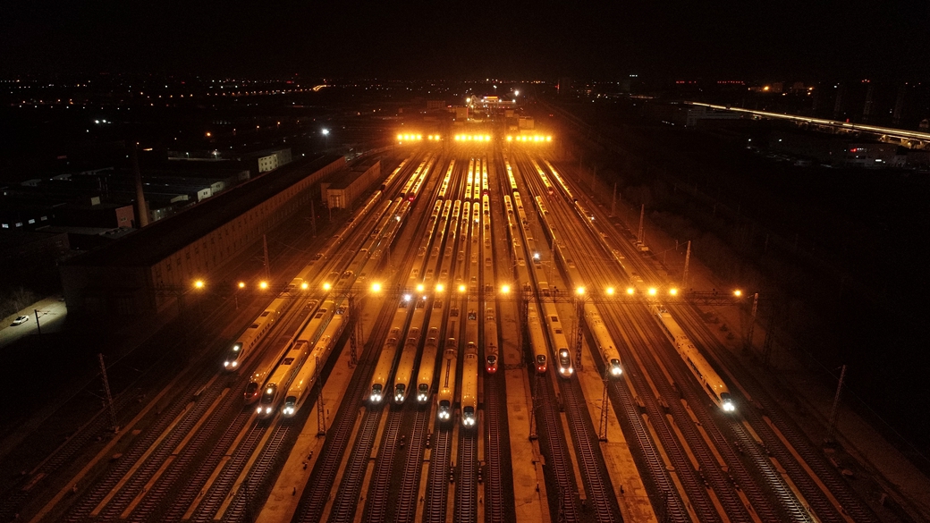 春运前夕,中国铁路沈阳局集团有限公司沈阳动车段沈阳北动车运用所内,20余辆整修完毕的动车组列车整齐列队、整装待发,宛如陆地“航空母舰”一般雄伟壮观。