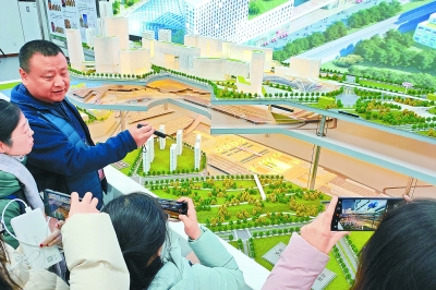 在临时搭建的工作室里,副中心站综合交通枢纽工程的立体沙盘格外“吸睛”。沙盘在工作人员的控制下,可分层升降,直观展示副中心站地面层和地下三层各自的建设规划。