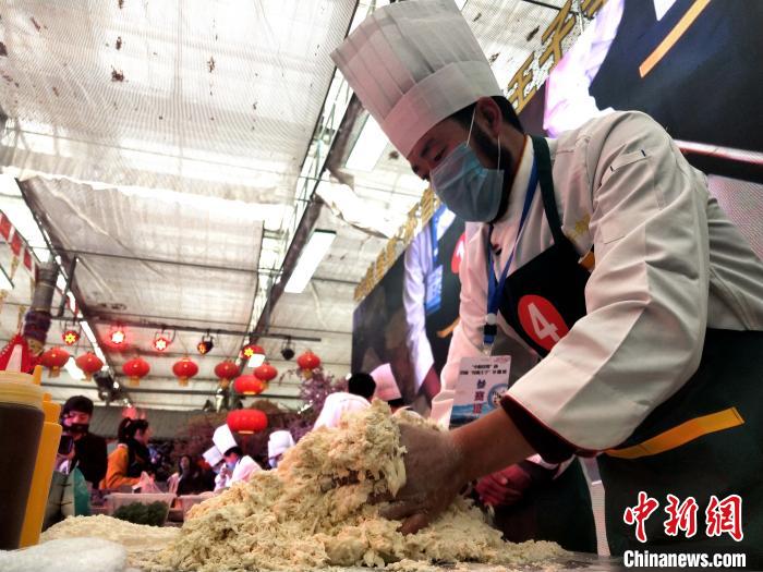 图为比赛现场,参赛选手正在和面。 张海雯 摄