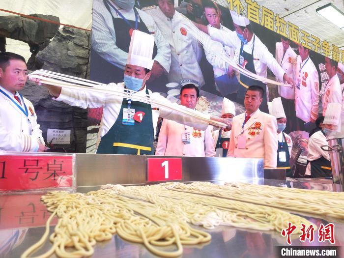图为比赛现场,参赛选手正在面剂拉成不同规格的面条。 张海雯 摄