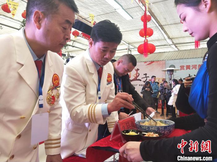 图为比赛现场,评委正在品评选手们做的牛肉面。 张海雯 摄