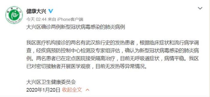北京市大兴区卫生健康委20日凌晨发布的公告显示,大兴区医疗机构接诊的两名有武汉旅行史的发热患者,根据临床症状和流行病学调查,经疾病预防控制中心检测及专家组评估,确认为新型冠状病毒感染的肺炎病例。两名患者已在定点医院接受隔离治疗,目前无呼吸道症状,病情平稳。大兴区已对密切接触者开展医学观察,目前无发热等异常情况。
