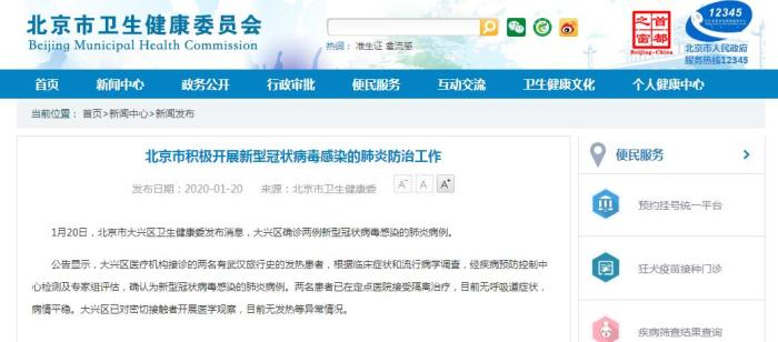 针对此情况,北京市卫生健康委员会20日表示,目前北京市已积极开展新型冠状病毒感染的肺炎防治工作,建立防控机制,多部门及时沟通情况,形成防治合力。