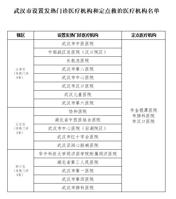 中新网1月20日电 据武汉市卫健委网站消息,今日,武汉市卫生健康委公布了武汉市发热门诊医疗机构和定点救治医疗机构名单。名单包括发热门诊61家,定点医疗机构9家。