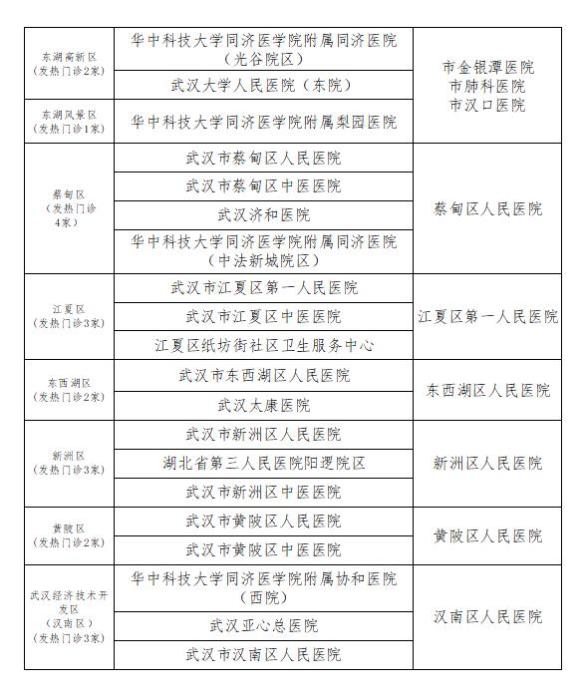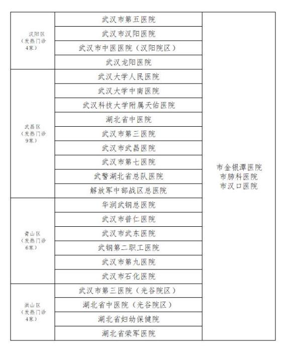 武汉市发热门诊61家,其中,中心城区41家,新城区20家,市管医院16家;武汉市定点医疗机构9家,其中,中心城区定点医疗机构为武汉市金银潭医院、武汉市肺科医院、武汉市汉口医院,远城区定点医疗机构为武汉市各区人民医院。