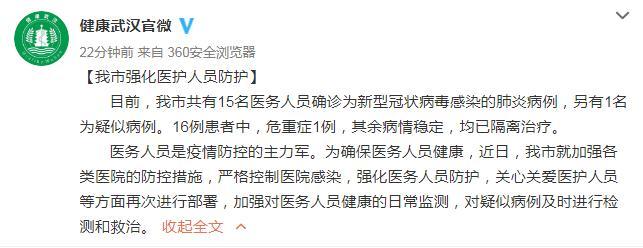 中新网1月21日电 21日凌晨,据武汉市卫健委官方微博消息,武汉共有15名医务人员确诊为新型冠状病毒感染的肺炎病例,另有1名为疑似病例。16例患者中,有危重症1例。
