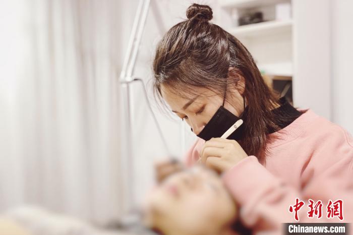 消毒手部和工具、给顾客卸妆眼部及清洁睫毛根部,再用眼贴膜把上下睫毛隔开……在湖南长沙德思勤商场一家日式美甲美睫沙龙,美睫师林榕正在给顾客种增大眼睛效果的“网红”芭比型开花睫毛。