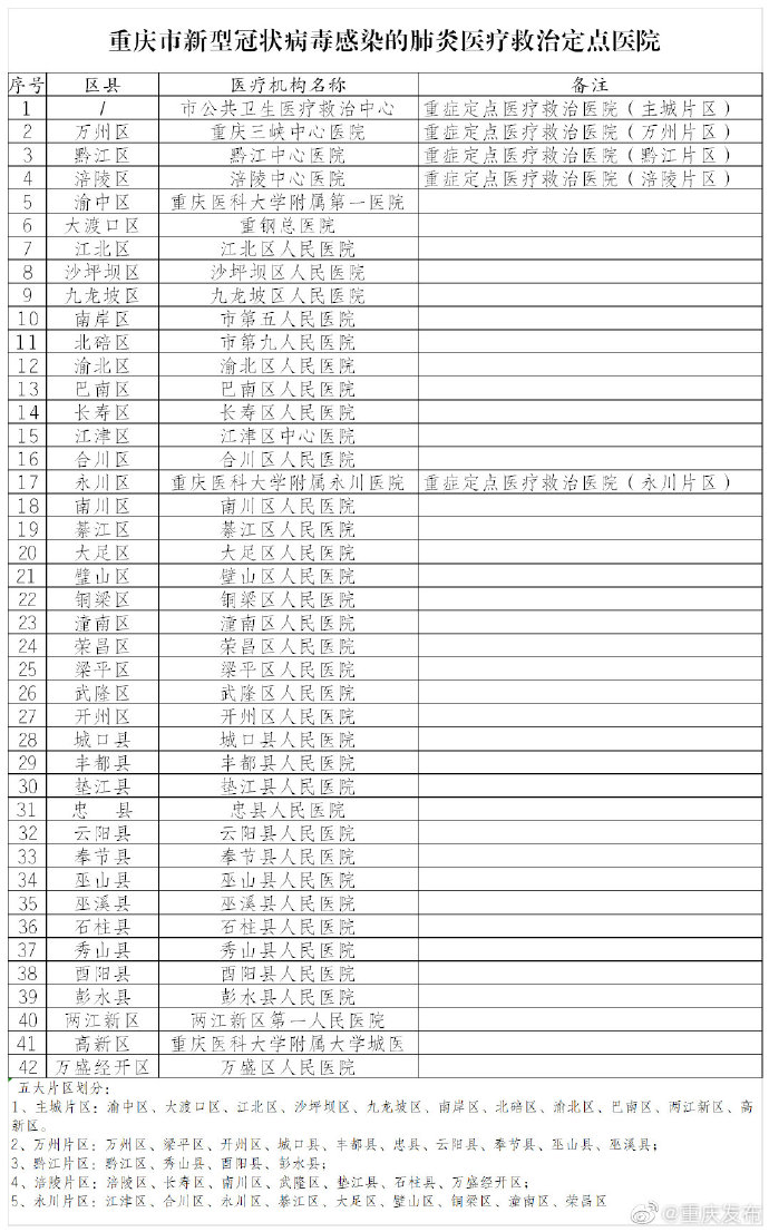 重庆市新型冠状病毒感染的肺炎救治定点医院发布