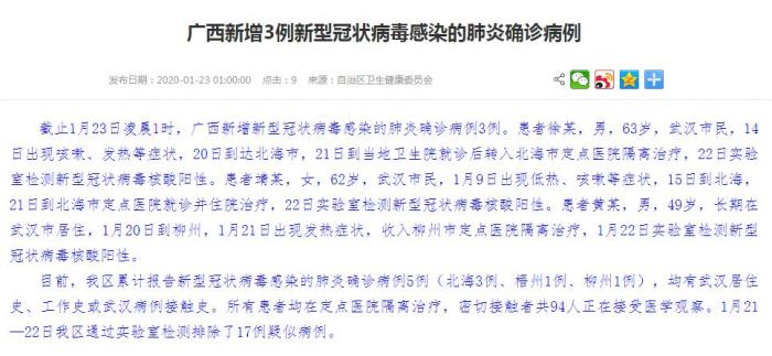 官方通报称,患者徐某,男,63岁,武汉市民,14日出现咳嗽、发热等症状,20日到达北海市,21日到当地卫生院就诊后转入北海市定点医院隔离治疗,22日实验室检测新型冠状病毒核酸阳性。患者靖某,女,62岁,武汉市民,1月9日出现低热、咳嗽等症状,15日到北海,21日到北海市定点医院就诊并住院治疗,22日实验室检测新型冠状病毒核酸阳性。患者黄某,男,49岁,长期在武汉市居住,1月20日到柳州,1月21日出现发热症状,收入柳州市定点医院隔离治疗,1月22日实验室检测新型冠状病毒核酸阳性。