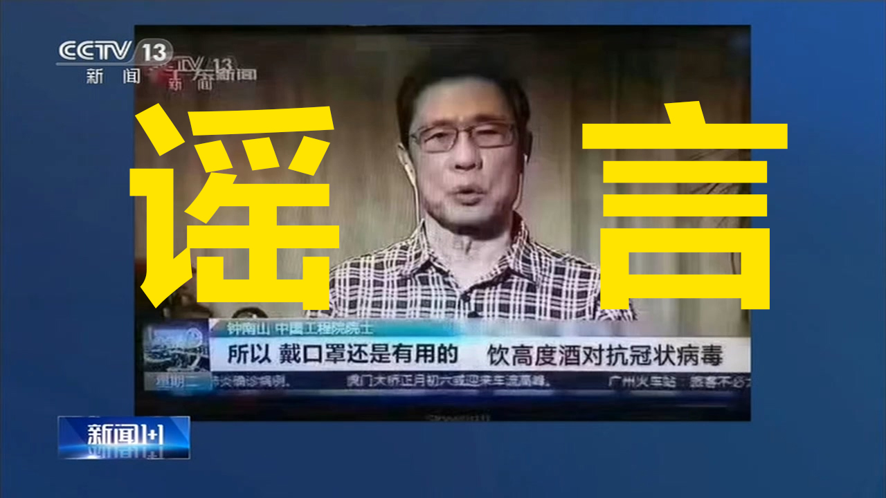 这张在网络上流传的图片,使用的是1月20日播出的《新闻1+1》连线钟南山院士的画面。造谣者将原视频字幕进行修改,模仿钟南山院士的口吻,前半句以符合当前防控疫情方法的“戴口罩还是有用的”让你信服,而后半句则是彻底的谣言——“饮高度酒对抗冠状病毒”。
