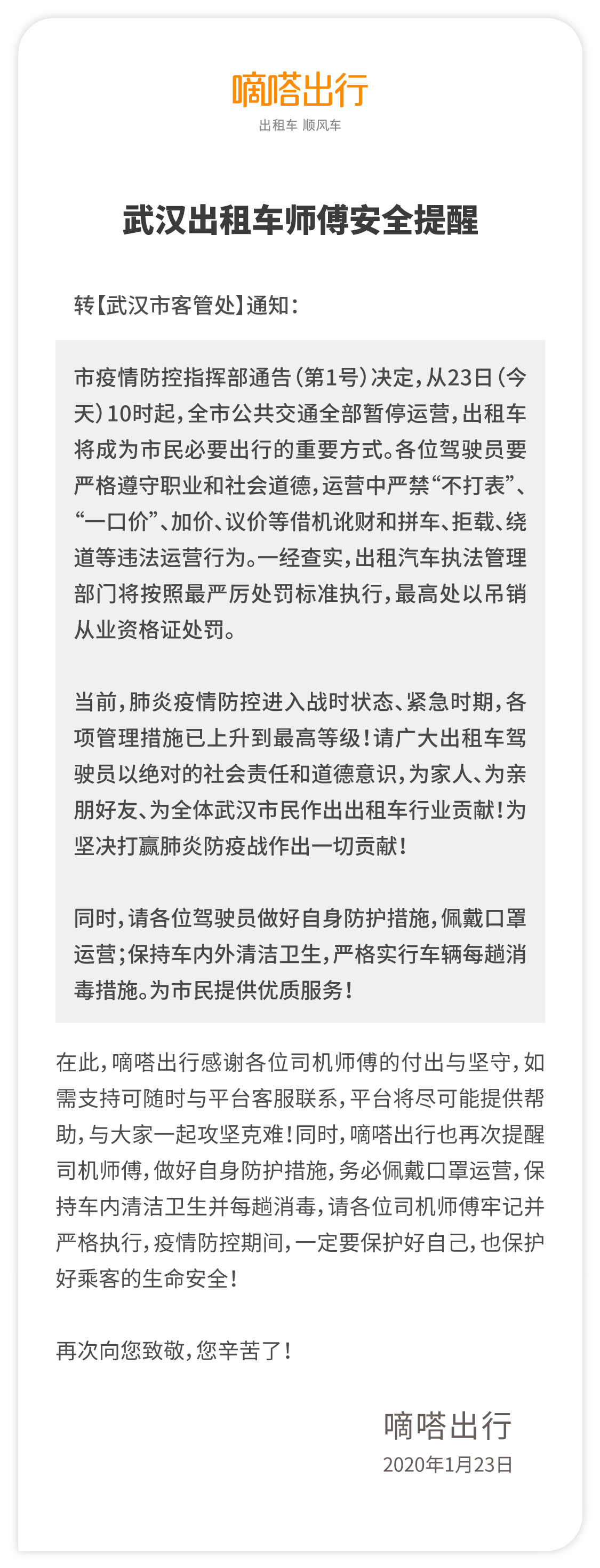 为了确保广大用户的生命安全和身体健康,响应市疫情防控指挥部通告,嘀嗒出行启动疫情一级响应,特决定:于1月23日10时起,暂时关闭武汉城际顺风车和市内顺风车通道;已有的进出武汉的城际订单,如未出发,全部取消行程,平台会第一时间通知用户,并全部免责免费取消。