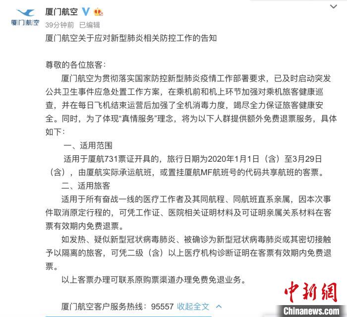中新网厦门1月23日电 (黄咏绸 张玮玲)厦门航空22日发布公告,将为相关医务工作者及其同行亲属提供免费退票服务。符合条件的旅客可凭相关证明材料在客票有效期内免费退票。