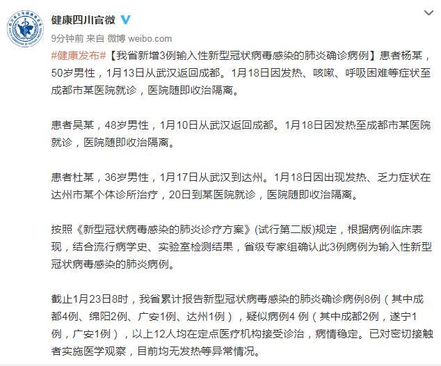 中新网1月23日电 据四川省卫生健康委员会官方微博23日消息,四川省新增3例输入性新型冠状病毒感染的肺炎确诊病例。