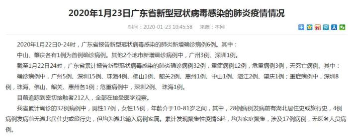 截至1月22日24时,广东省累计报告新型冠状病毒感染的肺炎确诊病例32例,重症病例12例,危重病例3例,无死亡病例。其中:
