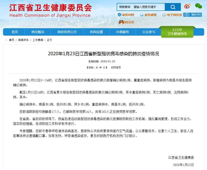 中新网1月23日电 据江西省卫健委网站消息,2020年1月22日0—24时,江西省报告新型冠状病毒感染的肺炎新增确诊病例1例,属重症病例。新增病例为南昌市报告首例确诊病例。